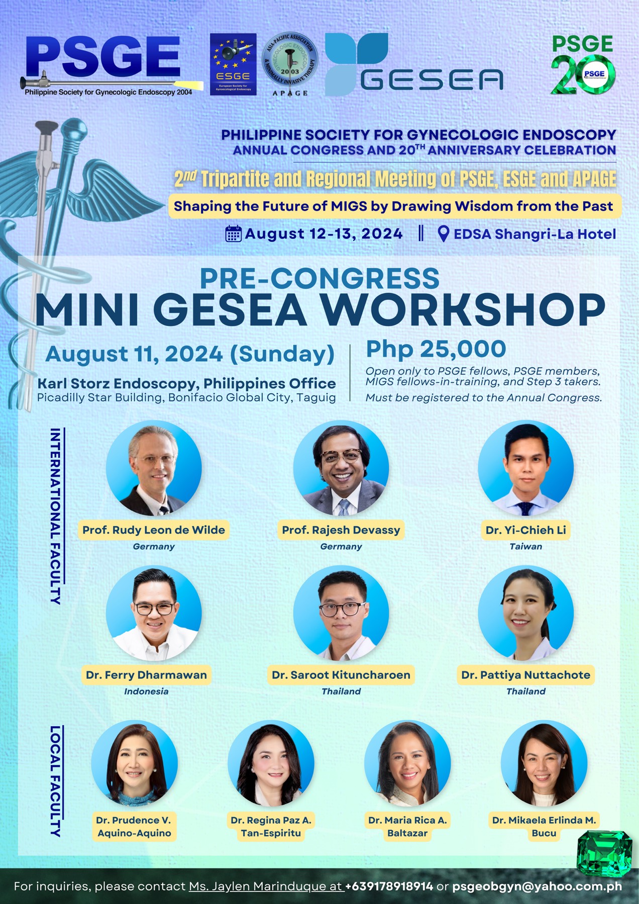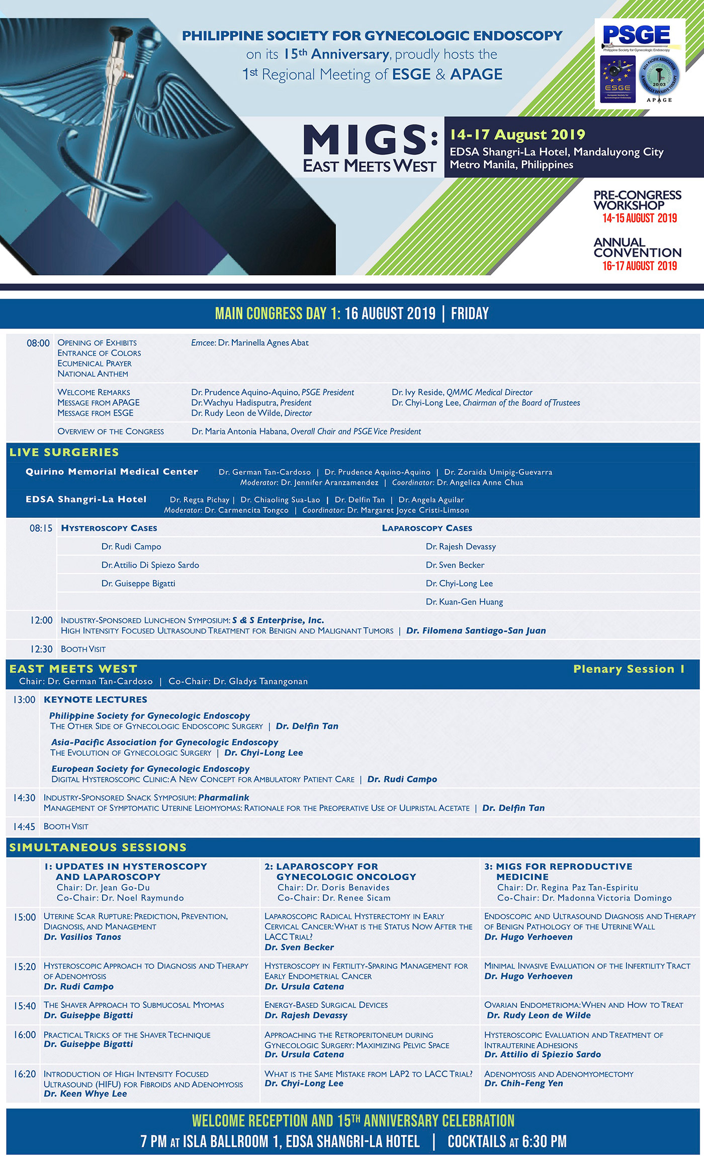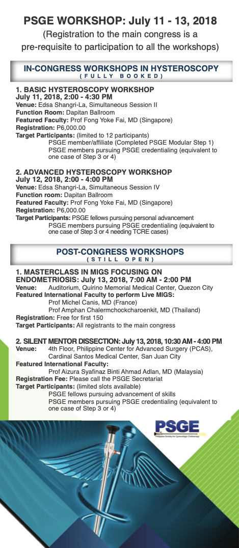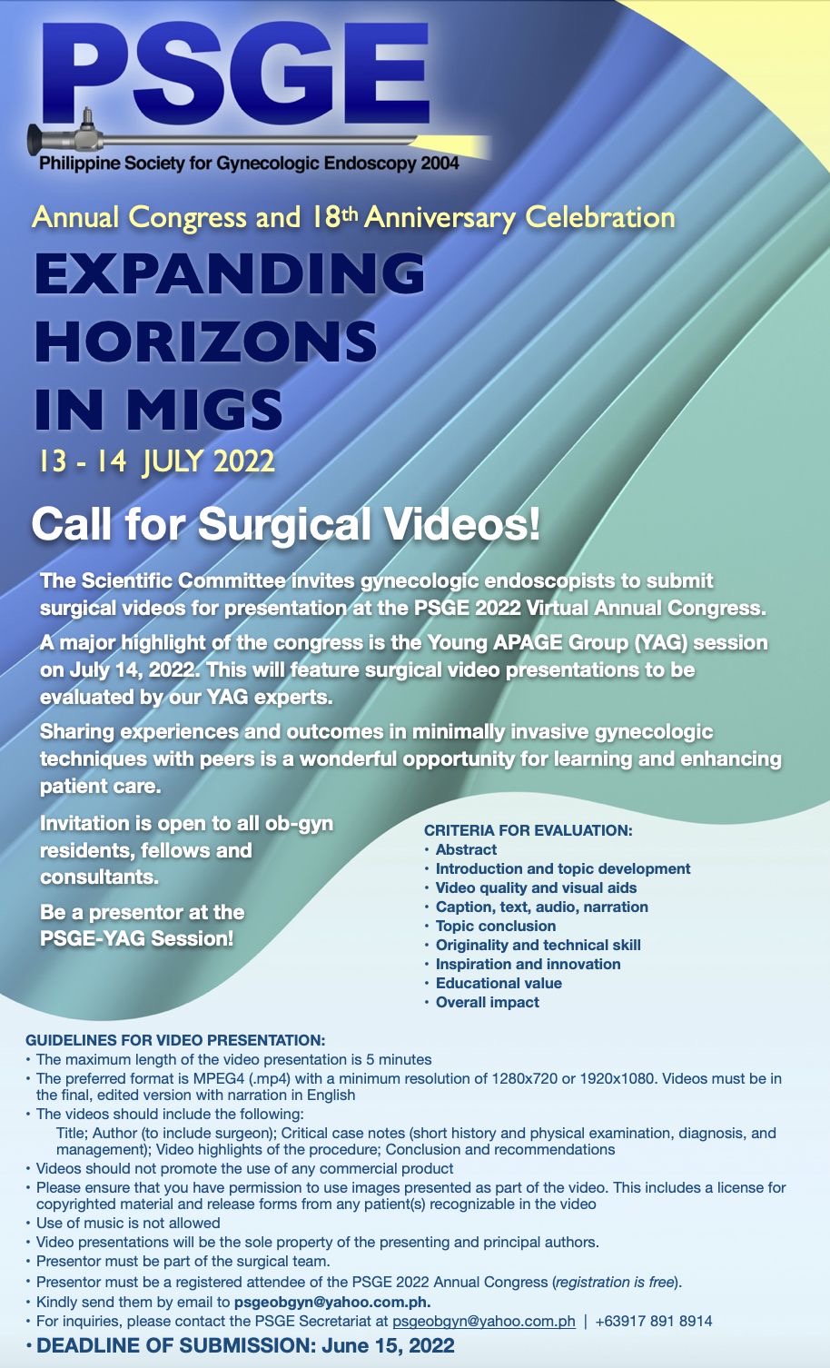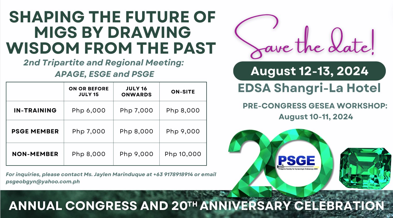 The 2-day congress will showcase personalities well-known for their in-depth knowledge in minimally invasive surgery. There will be Updates on Classification and Terminology in Endometriosis and Hysteroscopy, a PSGE-ESGE session on Adenomyosis, a PSGE-YAG APAGE Session plus other exciting sessions that are sure to stimulate your minds.